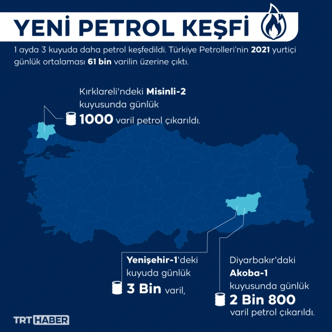 Cumhurbaşkanı Recep Tayyip Erdoğan petrol müjdesi verdi, "3 yeni kuyuda petrol keşfettik. Günlük üretimimiz 61 bin varilin üzerine çıktı" dedi.
