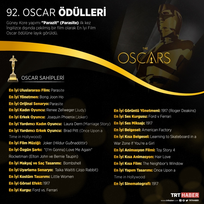 Beyaz perdenin en prestijli ödülleri kabul edilen Oscarlar sahiplerini buldu. Bu yıl 92'ncisi verilen Akademi Ödülleri'nde, İngilizce dışında bir yapım olan "Parazit" en iyi film ödülünü kazanarak tarih yazdı.
