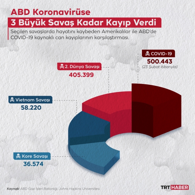COVID-19 salgınında büyük kayıp veren ABD’de hastalıktan yaşamını yitirenlerin sayısı yarım milyonu geçti. Bu, ABD’nin 3 büyük savaşta verdiği kaybı bile aştığı anlamına geliyor.