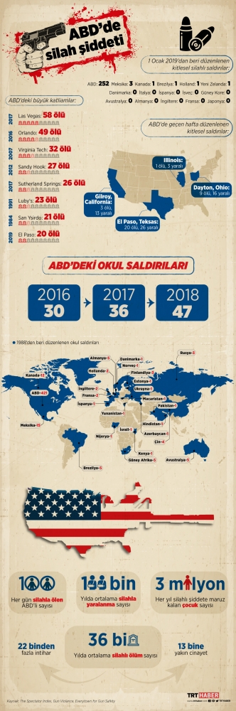 Gevşek silah yasaları, şiddete meyil... ABD yine peş peşe silahlı saldırılara sahne oldu. Silahlanma karşıtı ABD'li sivil toplum kuruluşlarına göre, her gün 100 Amerikalı silahla ölüyor. Bu sayı yılda 36 bini aşıyor.