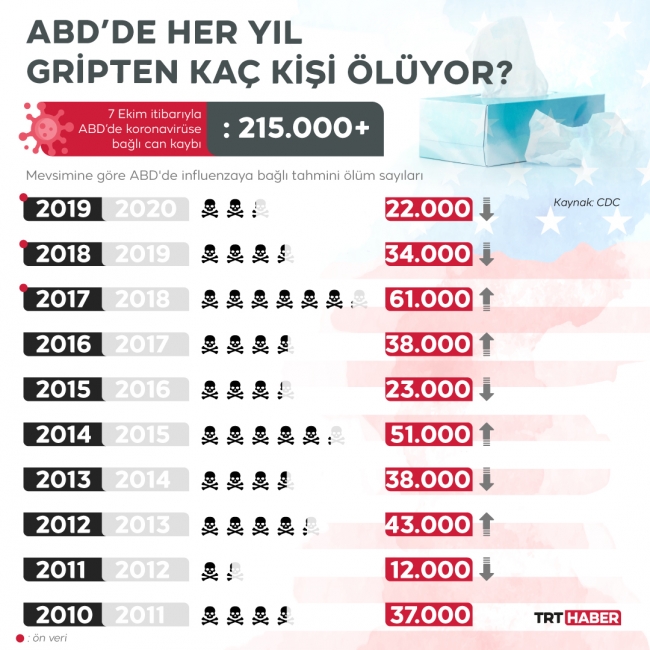 Grip mevsiminin başladığı ülkelerden biri de koronavirüs salgınının 200 binden fazla can aldığı ABD. Her ne kadar kendisi de COVID-19’a yakalanan Başkan Trump, koronanın gripten daha az ölümcül olduğunu savunsa da rakamlar pek öyle söylemiyor.