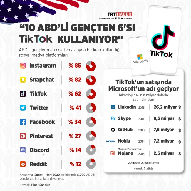 Çin menşeli sosyal medya uygulaması TikTok’un ABD’de yasaklanması ya da satın alınması tartışılıyor. Devralma için adı geçen teknoloji devi Microsoft. Araştırmalara göre ise 10 ABD’li gençten 6'sı TikTok kullanıyor.