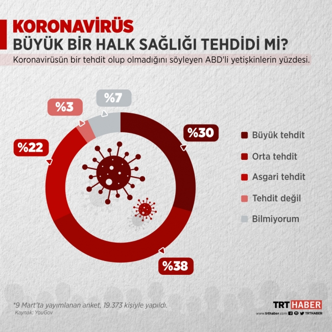 Çin’in Wuhan kentinde ortaya çıkıp tüm dünyaya dalga dalga yayılan koronavirüs nedeniyle ABD’de hayatını kaybedenlerin sayısı 30’u geçti, sıkı tedbirler alınıyor. Peki ABD’liler virüsle ilgili ne düşünüyor? Son ankete göz atalım.