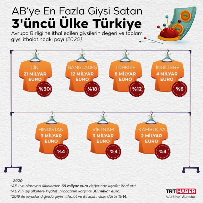 Eurostat'a göre, Avrupa Birliği ülkelerinin giyim ithalatı geçen yıl COVID-19 salgını nedeniyle yüzde 14 düştü. Türkiye ise yerini koruyarak, 8 milyar euro ile AB'nin en çok giysi ithal ettiği ülkeler arasında 3'üncü sırada.