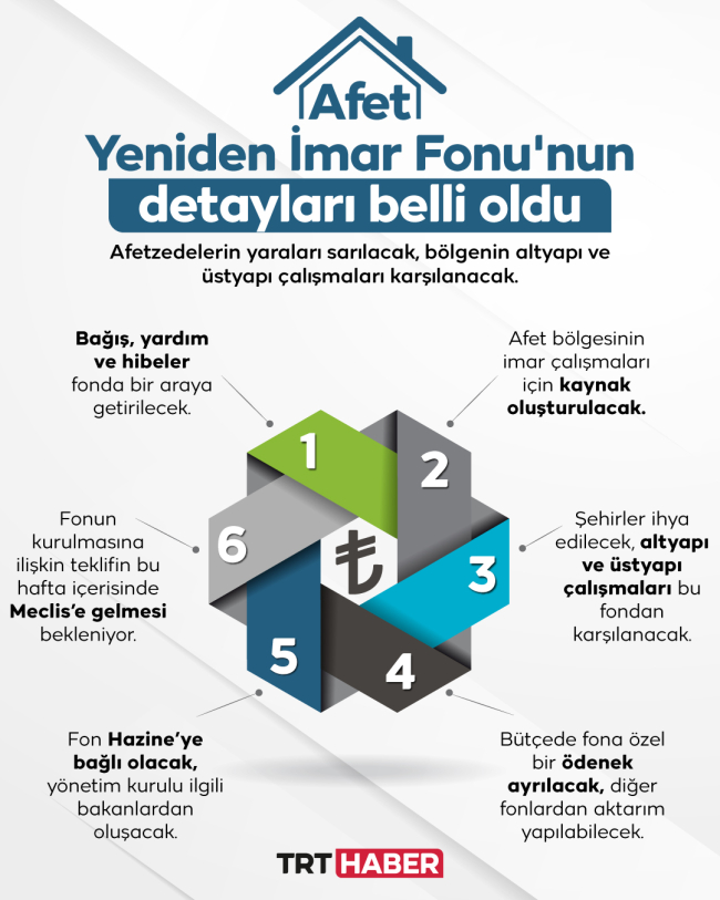 Afetzedelerin yaralarını sarmak için hazırlanan Afet Yeniden İmar Fonu ile afet bölgesinin altyapı ve üstyapı çalışmaları karşılanacak. Bağış, yadım ve hibeler bu fonda toplanarak şehirlerin ihyası için kaynak aktarılacak.