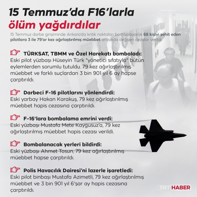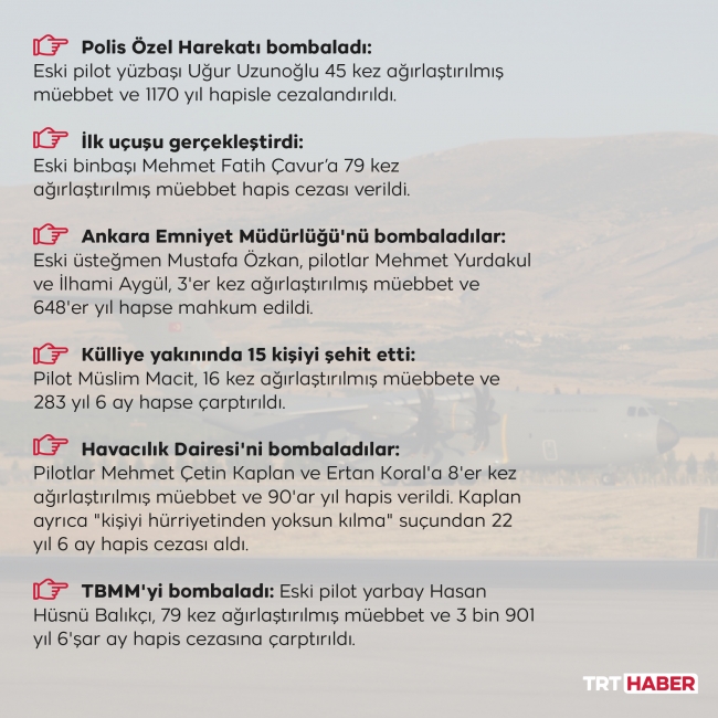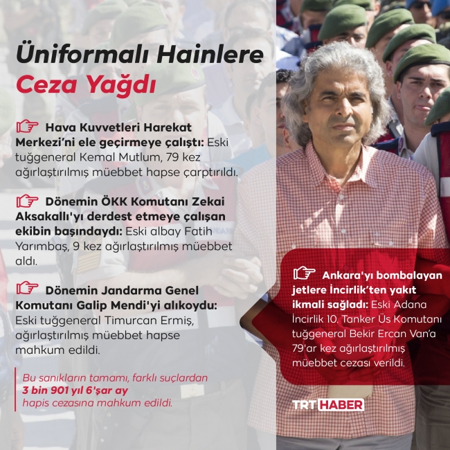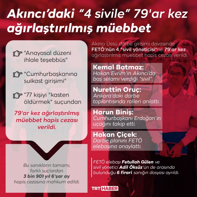 Fetullahçı Terör Örgütü'nün (FETÖ) 15 Temmuz 2016'daki darbe girişimi sırasında komuta merkezi olarak kullanılan Akıncı Üssü'ndeki eylemlere ilişkin davada örgütün 4 "sivil yöneticisi" ile 15 eski askere 79'ar kez ağırlaştırılmış müebbet verildi.