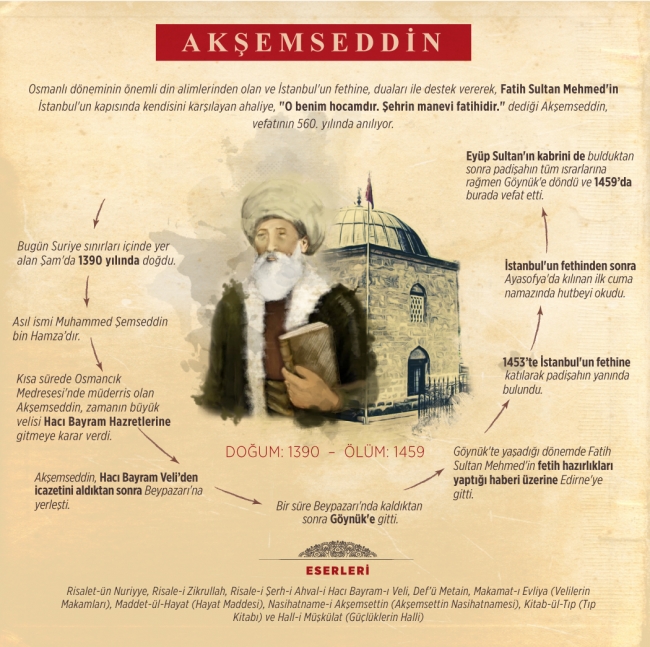 Fatih Sultan Mehmet'in İstanbul'un kapısında kendisini karşılayan ahaliye, "O benim hocamdır. Şehrin manevi fatihidir" dediği Akşemseddin, vefatının 560. yılında anılıyor.