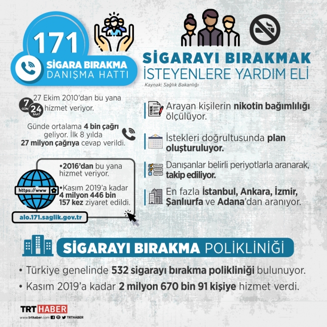 Sigarayı bırakmak isteyen fakat bunu başaramayanlar için çözüm bir telefon hatta bir tık kadar uzakta. ALO 171 Sigara Bırakma Danışma Hattı ve “alo.171.saglik.gov.tr” sigarayla vedalaşmak isteyenlerin yanında.