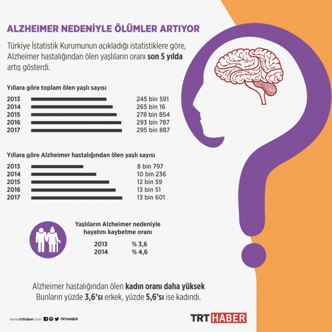 Türkiye İstatistik Kurumunun açıkladığı verilere göre, Alzheimer hastalığından ölen yaşlıların oranı 5 yılda yüzde 2 arttı.