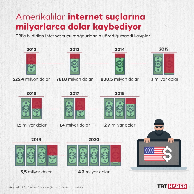 Koronavirüs pandemisiyle geçen 2020 yılında ABD kamuoyundan siber suçlarla ilgili rekor sayıda şikayet geldi. COVID-19'la ilgili dolandırıcılıkların da olduğu 800 bine yakın şikayetin Amerikalılara maliyeti 4,2 milyar dolar.