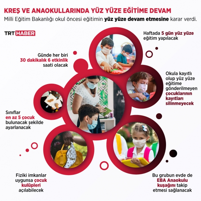 MEB: Resmi ve özel tüm anaokulu, ana sınıfı ve uygulama sınıflarında haftada 5 gün yüz yüze eğitim yapılmasının uygun olacağı değerlendirilmiştir.