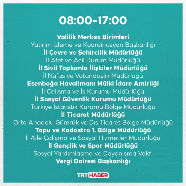 Ankara'da kurumların uzaktan ve dönüşümlü gibi esnek çalışma yöntemleri uygulanmaya devam edecek. Mesai saatleri, 08.00-17.00, 08.30-17.30, 09.00-18.00, 10.00-19.00 olarak dört farklı şekilde uygulanacak.