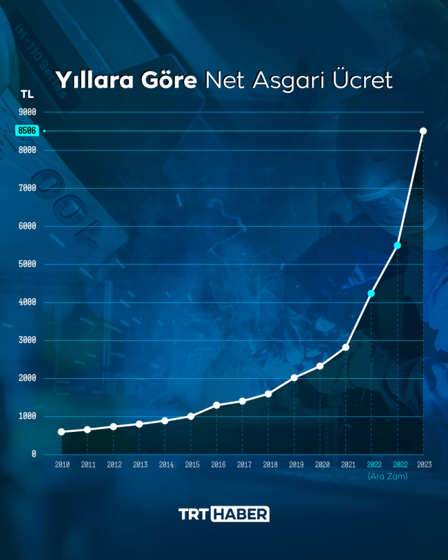 Cumhurbaşkanı Erdoğan, 2023 yılında uygulanacak asgari ücretin net 8 bin 500 lira olarak belirlendiğini açıkladı. Verilen ücrette işçi başına 250 liralık devlet desteği olacak.