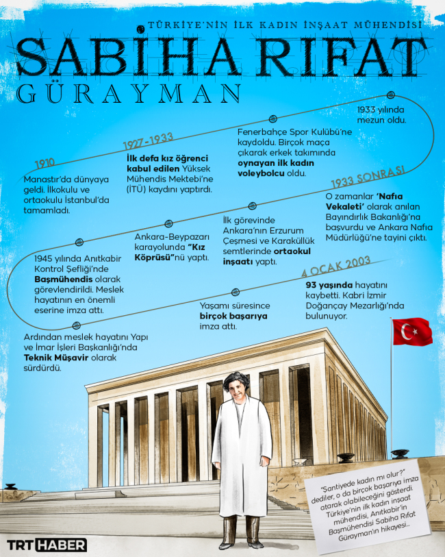 "Şantiyede kadın mı olur?" sözlerine aldırmadı ve imza attığı başarılarla olabileceğini herkese gösterdi… Türkiye'nin ilk kadın inşaat mühendisi Sabiha Rıfat Gürayman, Atatürk’e borcunu Anıtkabir'in inşaatındaki göreviyle ödedi.