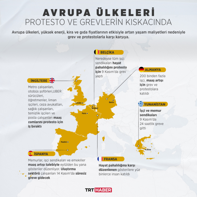 Avrupa ülkeleri, yüksek enerji, kira ve gıda fiyatlarının etkisiyle artan yaşam maliyetleri nedeniyle grev ve protestolarla karşı karşıya bulunuyor.
