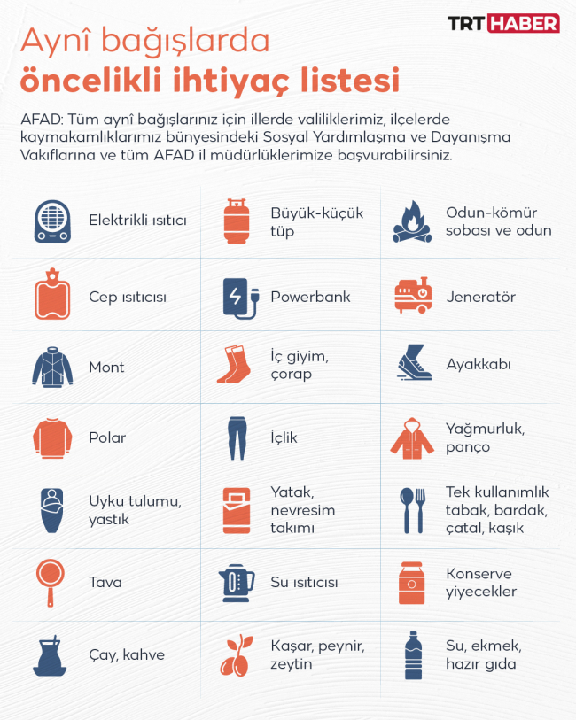 Afet ve Acil Durum Yönetimi Başkanlığı (AFAD), deprem bölgesine yapılacak aynî bağışlar için illerde valilikler, ilçelerde kaymakamlıklar bünyesindeki vakıflara ve tüm AFAD il müdürlüklerine başvurulabileceğini belirterek, öncelikli ihtiyaç listesini paylaştı.