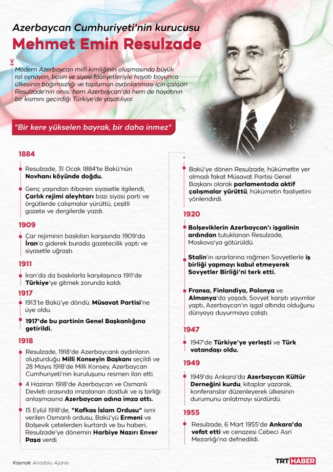 "Bir kere yükselen bayrak, bir daha inmez" sözlerinin sahibi, 28 Mayıs 1918'de bağımsızlığını ilan eden Azerbaycan Cumhuriyeti'nin kurucusu Mehmet Emin Resulzade, vefatının 66. yılında anılıyor.
