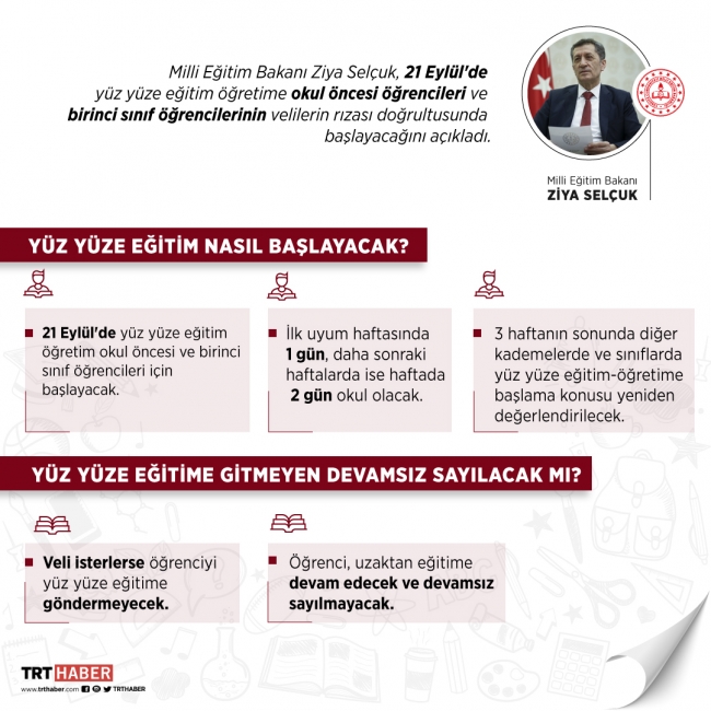 Milli Eğitim Bakanı Ziya Selçuk, "Yüz yüze eğitime başlama konusunda veli rızası, bizim için önemlidir. Velilerimiz isterlerse öğrenciyi yüz yüze eğitime göndermeme konusunda mazeret beyan edebilirler" dedi.
