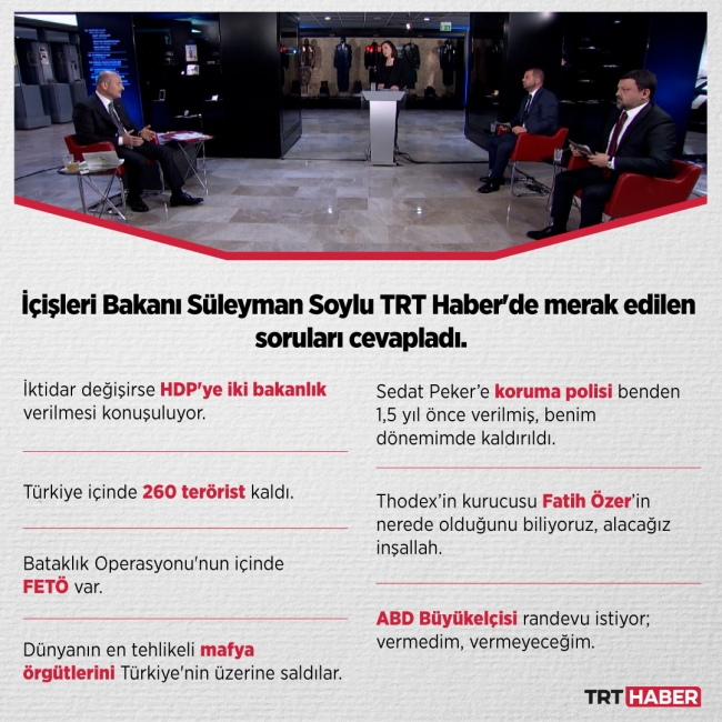 İçişleri Bakanı Süleyman Soylu organize suç örgütü lideri Sedat Peker'in ithamlarına yanıt verdi, "Operasyon emrini veren bizzat benim" dedi. Soylu, koruma polisinin kendinden 1,5 sene önce verildiğini, kendi döneminde kaldırıldığını da açıkladı.