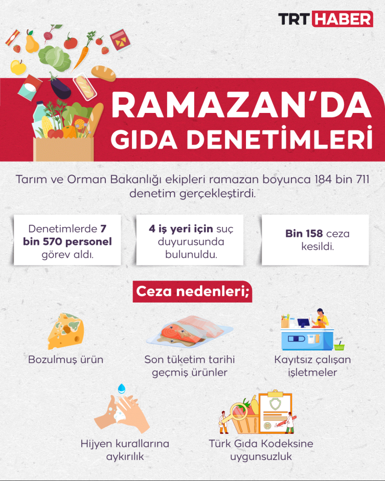 Tarım ve Orman Bakanlığı ekipleri ramazan boyunca 184 bin 711 denetim gerçekleştirdi. 4 iş yeri için suç duyurusunda bulunan ekipler toplamda 1158 ceza kesti.