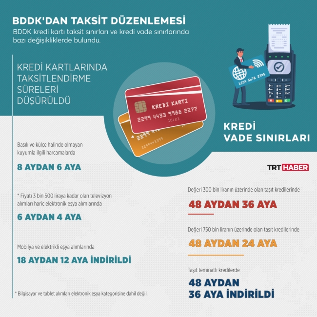 Bankacılık Düzenleme ve Denetleme Kurumu kredi kartlarında taksitlendirme sürelerini düşürürken, taşıt kredilerinde de vade sınırlarını indirdi.