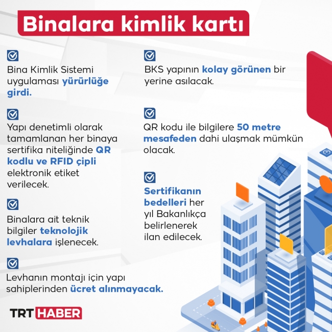 Bina Kimlik Sistemi uygulaması yürürlüğe girdi. Binalara ait teknik bilgiler teknolojik levhalara işlenecek, QR kodu ile bilgilere 50 metre mesafeden dahi ulaşmak mümkün olacak.
