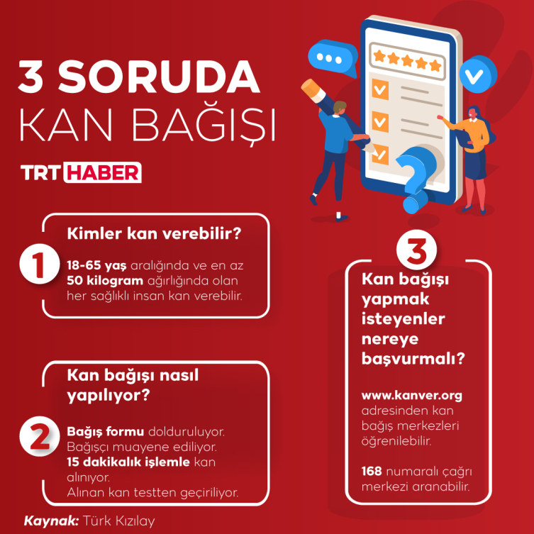 Kan, sürekli bir ihtiyaç… Sadece 15 dakika süren bir işlemle alınan kan, hastaları hayata bağlıyor. Bağış yapmak isteyenlerin en yakın noktadaki Türk Kızılay kan merkezine gitmesi yeterli.