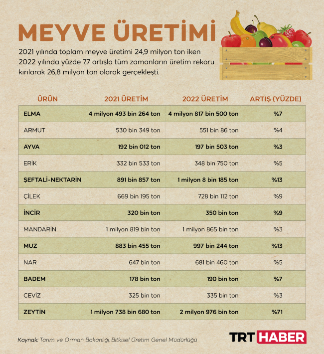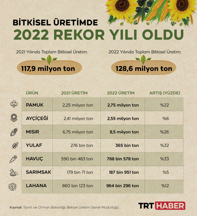 2022 yılı Türkiye’de bitkisel üretimde rekorların kırıldığı yıl oldu. 2022’de bitkisel üretim 128,6 milyon ton ile son yüzyılın en yüksek düzeyinde gerçekleşti. Havuç, sarımsak, lahana sebzeler içinde ilk sırayı alırken, pamuk, ayçiçeği, mısır gibi ürünler, yine üretim patlaması yaşanan türler oldu. En yüksek artış ise zeytin ve zeytinyağında…