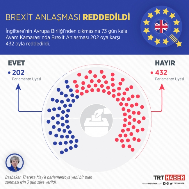 İngiltere’nin Avrupa Birliği’nden çıkmasına 73 gün kala Avam Kamarası’nda Brexit Anlaşması 202 oya karşı 432 oyla reddedildi.