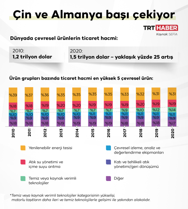 Ülkeler çevre adına adımlar attıkça yenilenebilir enerji ekipmanları gibi çevresel ürünlerin ticareti hızlanıyor. Bu ürünleri üretebilen ve ticaretini yönetebilen ülkeler ön plana çıkarken, diğer ülkeler ‘enerji dönüşümünde dışa bağımlılık’ endişelerini dile getiriyor.