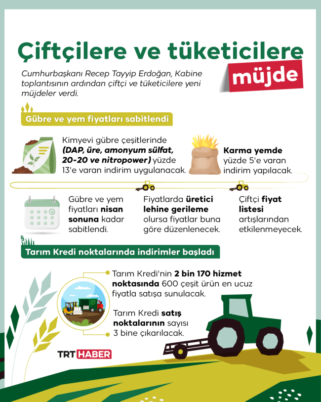 Cumhurbaşkanı Erdoğan, kabine toplantısının ardından çiftçi ve tüketicilere yeni müjdeler verdi. Gübre ve yem fiyatlarının nisan sonuna kadar sabitlendiğini duyuran Erdoğan, Tarım Kredi satış noktalarının sayısının 3 bine çıkarılacağını söyledi.