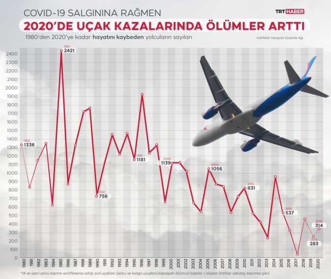 Yeni tip koronavirüs salgını nedeniyle dünya genelindeki ticari uçuşlar 2019’a göre geçen yıl neredeyse yarı yarıya azaldı ancak can kayıplarında artış var. 2020’de 8 ölümcül kaza ve 300’ün üzerinde ölüm kayıtlara geçti.
