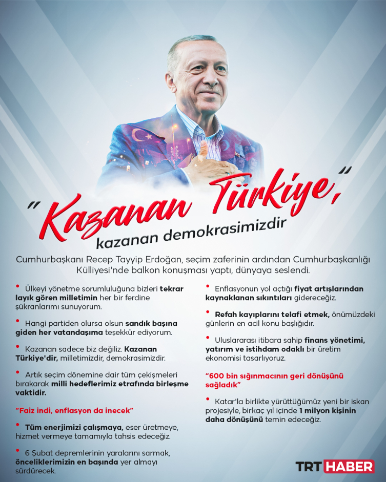 Cumhurbaşkanı Recep Tayyip Erdoğan, "Milletimizin her iradesi gibi bu sonucun da başımızın üstünde yeri vardır. Fakat kazanan sadece biz değiliz. Kazanan Türkiye'dir, kazanan tüm kesimleriyle milletimizin ta kendisidir, kazanan demokrasimizdir." dedi.
