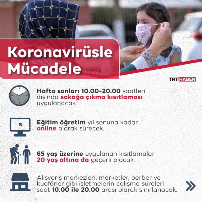 Cumhurbaşkanı Erdoğan, "Hafta sonları tedarik ve üretim zincirleri aksamayacak şekilde 10.00 ile 20.00 saatleri arası dışında sokağa çıkma sınırlaması uygulanacak." dedi.