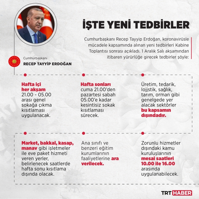 Cumhurbaşkanı Erdoğan, Kabine Toplantısı'nın ardından yaptığı açıklamada, "Hafta içi her gün gece saat 21.00 ile sabah 05.00 arasında genel sokağa çıkma sınırlaması uygulanacaktır" dedi.