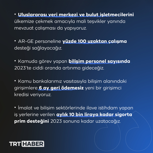 Cumhurbaşkanı Erdoğan, 7 maddelik teknoloji destek paketini açıkladı. Paketle teknoloji geliştirme bölgelerinde çalışanlara yüzde 100 uzaktan çalışma desteği sağlanacağını söyledi. Bilişim alanındaki girişimlere de 6 ay geri ödemesiz kredi verileceğini duyurdu.