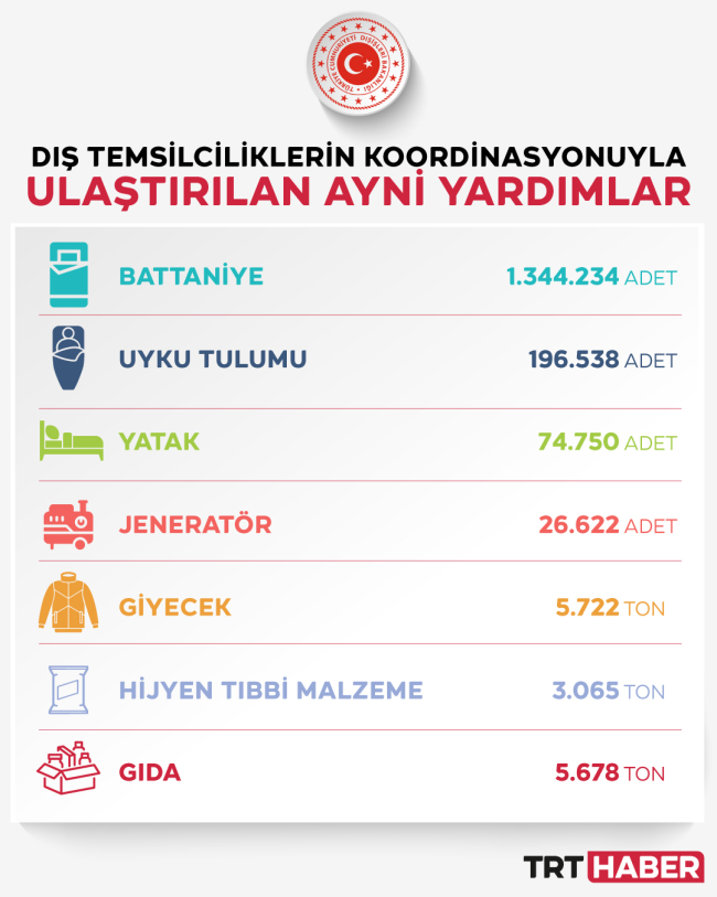 Dışişleri Bakanlığı'nın koordinasyonu ile deprem bölgelerine ulaştırılan yardımlar.