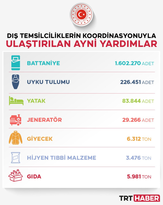 Kahramanmaraş merkezli depremlerin ardından dış temsilciliklerin eş güdümüyle deprem bölgesinde 28 ülke 30 sahra hastanesi kurdu. Şu ana kadar 130 bin çadır, 1168 yaşam konteyneri ve 1676 mobil hijyen ünitesi Türkiye'ye getirildi.