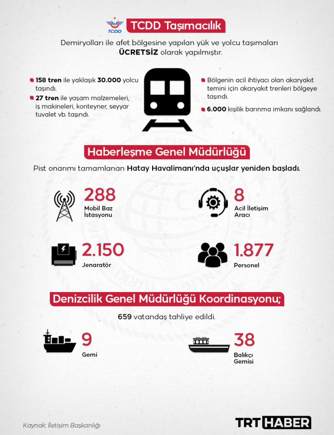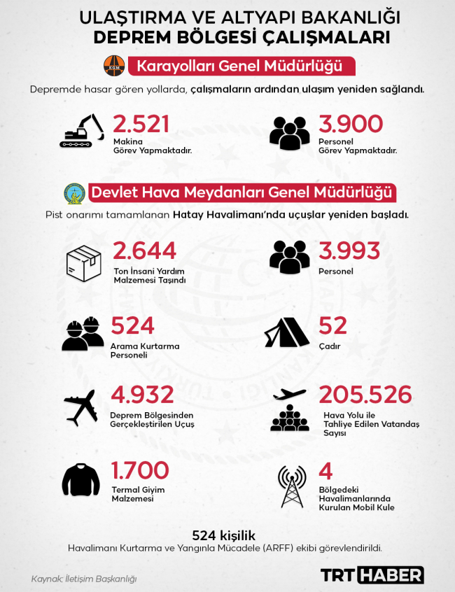 Depremin hemen ardından harekete geçen Ulaştırma ve Altyapı Bakanlığı ekipleri 4 bine yakın personel ve 2 bin 500’den fazla iş makinesi ile sahaya indi. Havaalanı, yollar tamir edildi, havayolu ile 205 bin, trenle 30 bin depremzede taşındı.