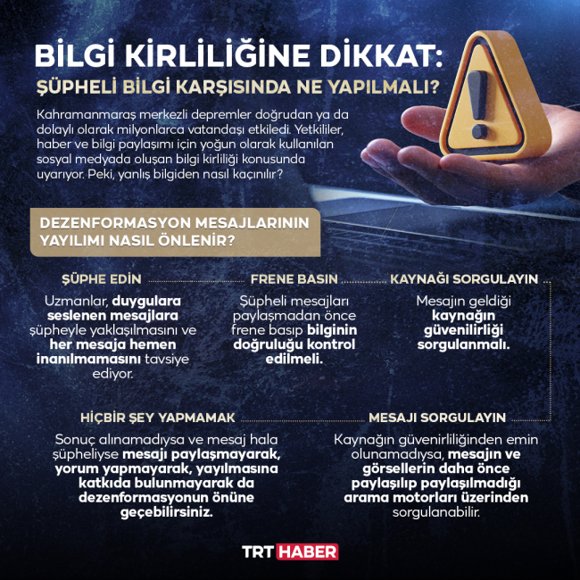 Kahramanmaraş depremleri sonrasında dezenformasyonun gerçeğin önüne geçmemesi için dikkatli olmak gerekiyor. Uzmanlar sosyal medyada oluşan bilgi kirliliğine karşı uyarıyor. Doğru bilgi için resmi kaynakları takip etmek, şüpheli bilgilere temkinli yaklaşmak atılabilecek adımlardan bazıları.