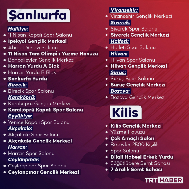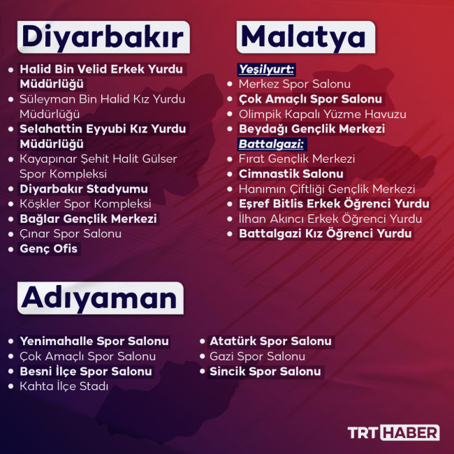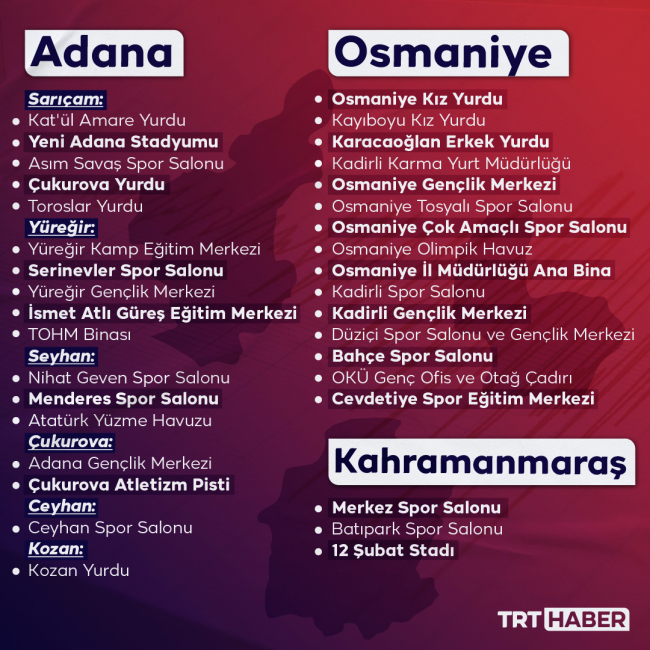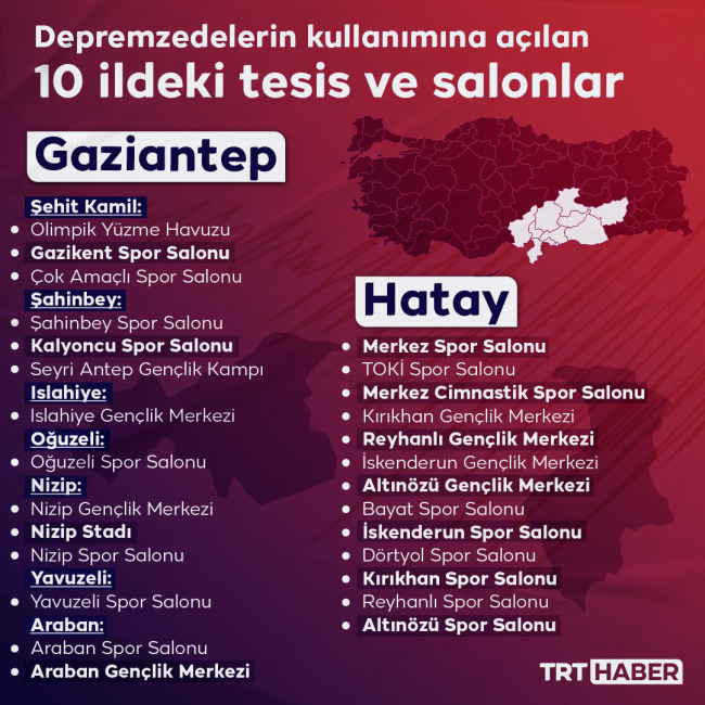 Depremzedelerin kullanımına açılan 10 ildeki tesis ve salonlar