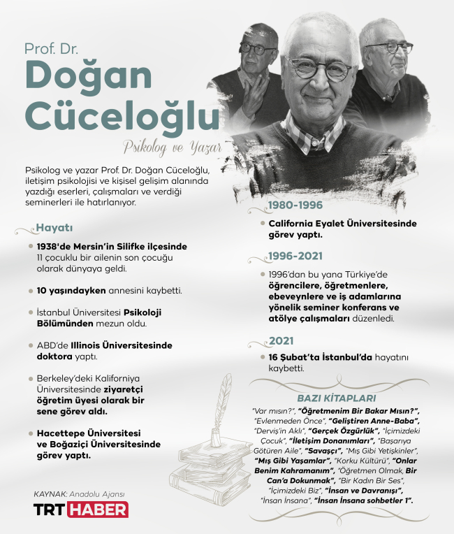 Fikir ve eserleriyle Türk halkının gönlünde yer eden psikolog ve yazar Prof. Dr. Doğan Cüceloğlu hayatını kaybedeli 2 yıl oldu.