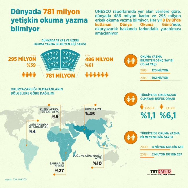 UNESCO raporlarında yer alan verilere göre, dünyada 486 milyon kadın ve 295 milyon erkek okuma yazma bilmiyor.