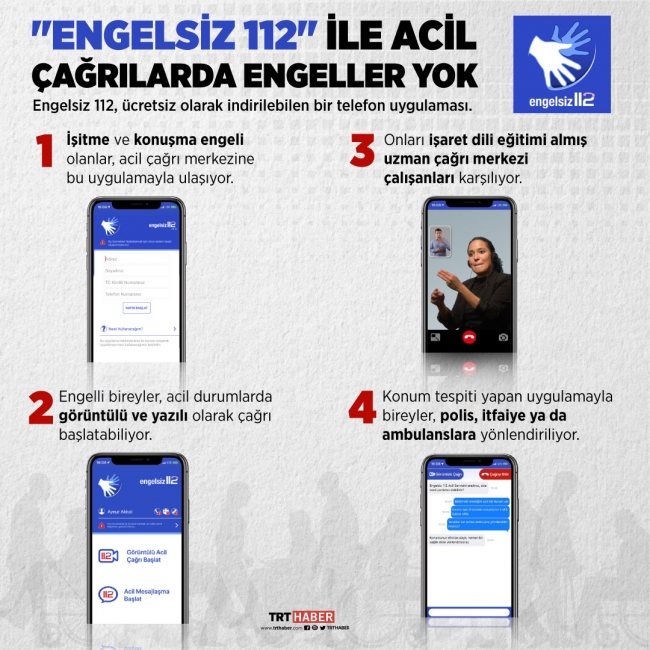 Engelsiz 112, ücretsiz olarak indirilebilen bir telefon uygulaması. İşitme ve konuşma engeli olanlar, acil çağrı merkezine bu uygulamayla ulaşıyor. İçişleri Bakanlığının başlattığı "Engelsiz 112" uygulamasıyla engeller ortadan kalktı.