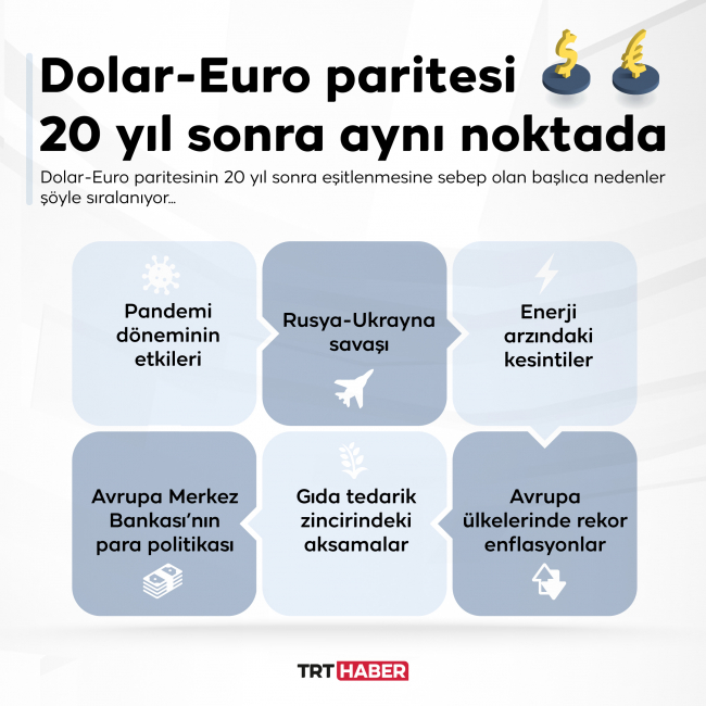 Dünya ekonomisinin en temel dinamiklerinden biri olan Dolar-Euro paritesi 20 yıl sonra ilk kez dolar lehine değişti ve iki para birimi eşitlendi. Peki, bu noktaya nasıl gelindi, önümüzdeki süreçte neler bekleniyor? Detaylar haberimizde…