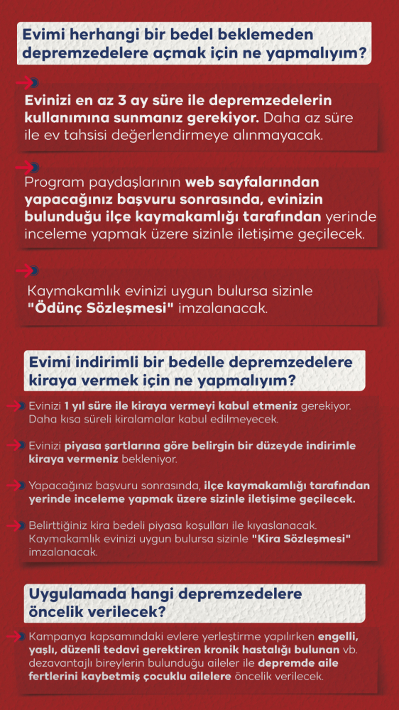 "Evim Yuvan Olsun" kampanyasıyla evini kaybeden depremzedelere evlerine kavuşana kadar yuva kuruluyor. Peki, ev ne kadar süreliğine tahsis edilecek, kimlere öncelik verilecek, faturalar kim tarafından ödenecek? Detaylar haberimizde.