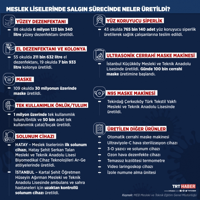 Koronavirüs salgını sürecinde Türkiye tek yürek oldu. Meslek liselerindeki fedakar öğretmen ve öğrenciler de koronavirüs mücadelesine ürettikleriyle katkı sağlıyor.
