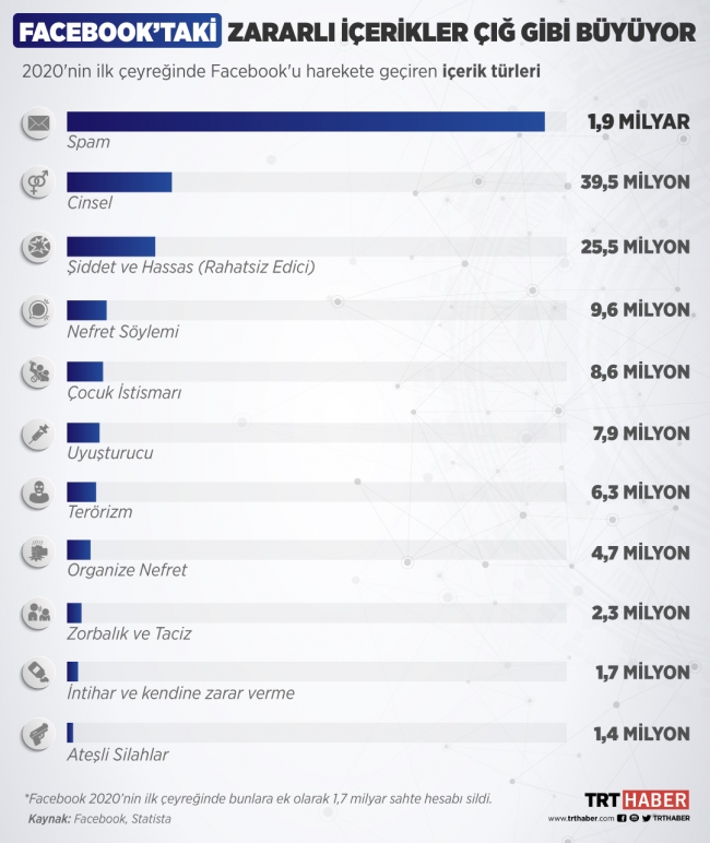 Popüler sosyal medya ağı Facebook’taki zararlı içerikler, çığ gibi büyüyor. Şirket bu içeriklerle mücadele halinde olduğunu rakamlarla ortaya koydu. Bu yılın ilk 3 ayında, çeşitli kategorilerdeki milyonlarca içerik ve sahte hesap silindi.