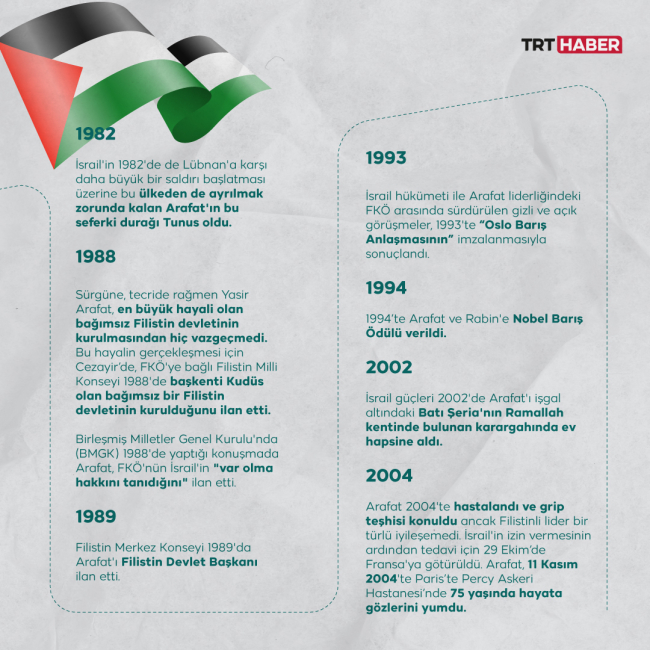 Filistin'in efsanevi lideri Yasir Arafat'ın ölümünün üzerinden 18 yıl geçse de o hala hafızalarda Filistin davasının en önemli simgesi olmaya devam ediyor.