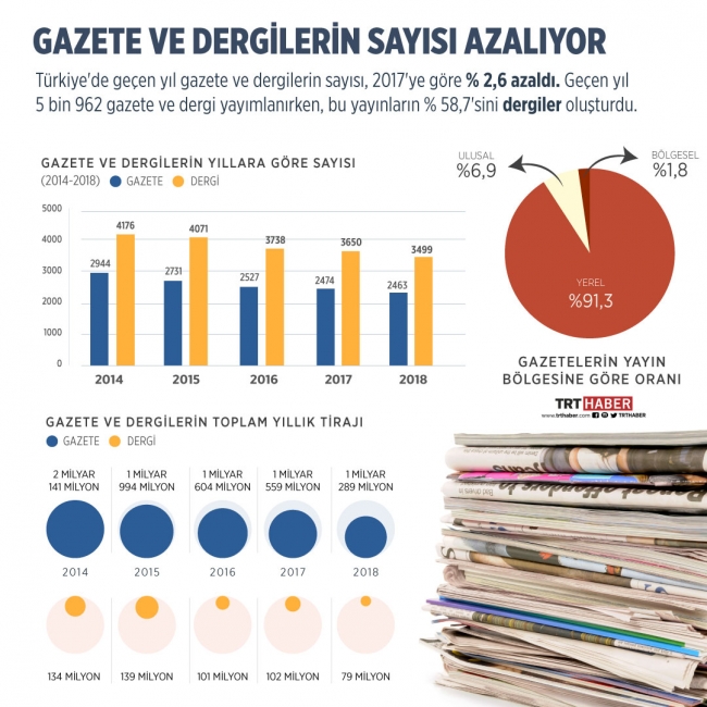 Türkiye'de geçen yıl gazete ve dergilerin sayısı, 2017'ye göre yüzde 2,6 azaldı. Geçen yıl 5 bin 962 gazete ve dergi yayımlanırken, bu yayınların yüzde 58,7'sini dergiler oluşturdu.